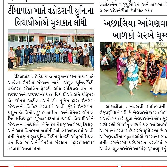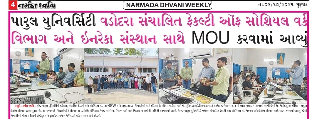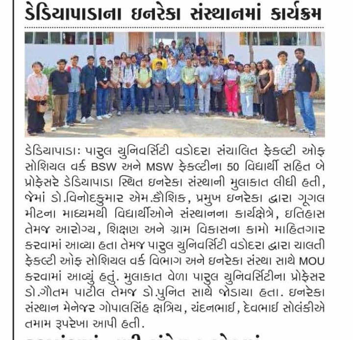 More over , a Memorandum of Understanding (MoU) was signed between the Faculty of Social Work, Parul University, Vadodara, and the INRECA Sansthan for long term collaboration to facilitate and demonstrate field exposure to the students perusing higher degrees in rural development stream to engage with the INRECA for their research projects, rural camps and other academic activities.આજ રોજ પારુલ યુનિવર્સિટી વડોદરા, સંચાલિત ફેકલ્ટી ઑફ સોશિયલ વર્ક, ના BSW અને MSW ના 50 વિધાર્થીઓ અને પ્રોફેસર Dr. ગૌતમ પાટીલ, અને Dr. પુનિત દ્વારા ઇનરેકા સંસ્થાન ની Exposure વિઝિટ કરવામાં આવી જેમાં ડૉ. વિનોદ કુમાર કૌશિક સર , પ્રમુખ ઇનરેકા સંસ્થાન દ્વારા ગૂગલ મીટ ના માધ્યમથી વિદ્યાર્થીઓને સંસ્થાનના કાર્યક્ષેત્રે, ઇતિહાસ તેમજ આરોગ્ય, શિક્ષણ અને ગ્રામ વિકાસ ના કામોની માહિતી આપવામાં આવી. તેમજ પારુલ યુનિવર્સિટી વડોદરા સંચાલિત ફેકલ્ટી ઑફ સોશિયલ વર્ક વિભાગ અને ઇનરેકા સંસ્થાન સાથે MOU કરવામાં આવ્યું, જેમાં વિધાર્થીઓ પોતાના Research Project, Rural camp , વેગેરે કાર્ય માટે સંસ્થાન સાથે જોડાશે.