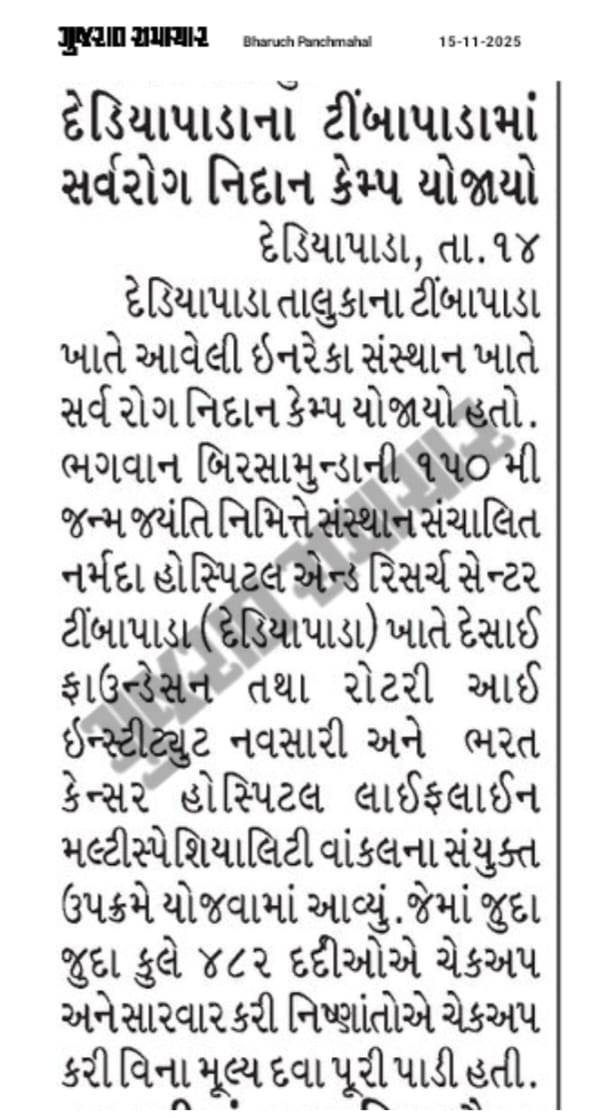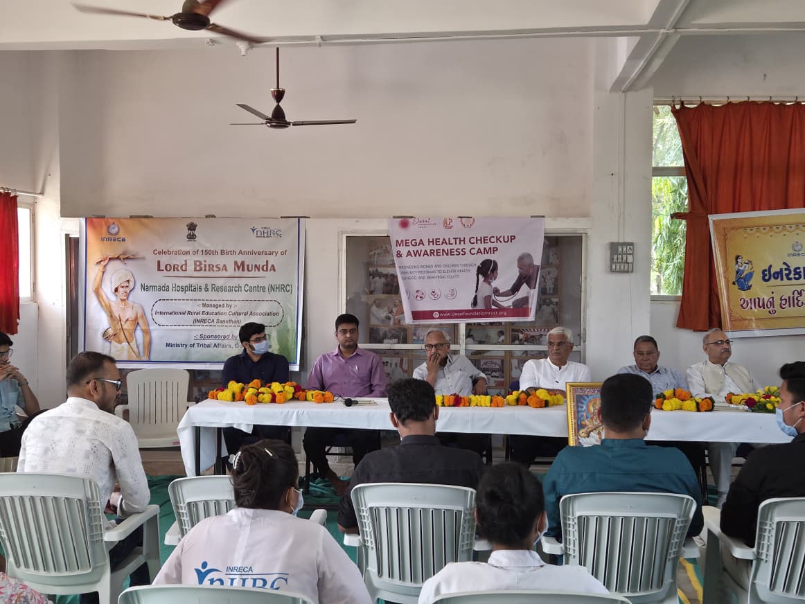 Organised General Health Camp on the eve of Bhagwan Birsa Munda 150th Birthday Anniversary Celebrations by Narmada Hospitals & Research Center ( NHRC) managed by INRECA Sansthan Gujarat along with other institutions like Rotary Eye Hospital and Lifeline Hospital where 482 patients are treated of multiple diseases like Eye, Oncology, Ortho, General Medicine, Gynec and Paediatric patients.